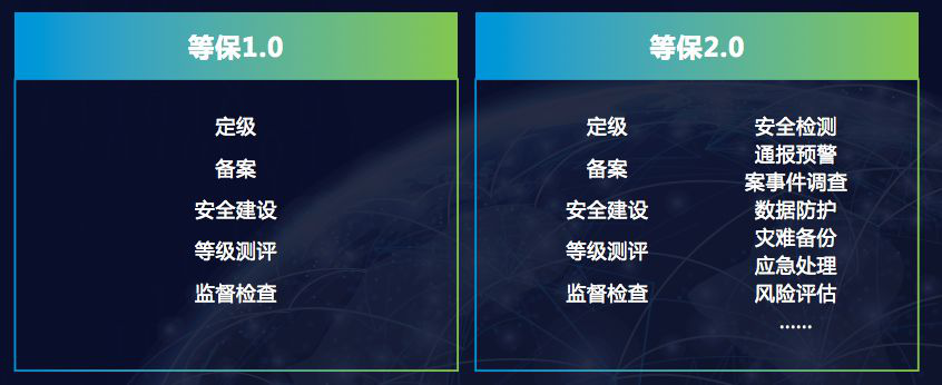 等保2.0不仅进一步明确定级、备案、安全建设、等级测评、监督检查等1.0时代的规定动作,最主要的是把安全检测、通报预警、案事件调查等措施都将全部纳入等级保护制度并加以实施。